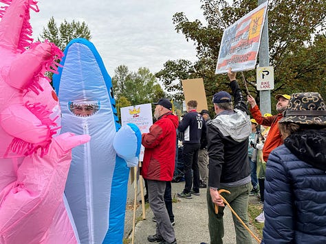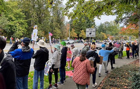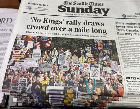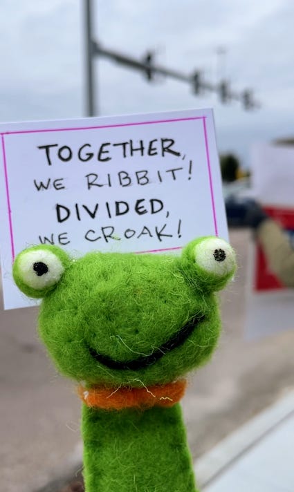 No Kings Day was a lot of fun. I was in a small city and we filled both sides of a busy road for almost a mile. It was a festive event filled with constant honking, music, dancing, chanting, clever signs, and costumes. Being in that big group was exciting especially knowing that, at the same time, there were huge crowds of everyday people doing the same thing across the nation. I hope you had fun where you went. The protests were all peaceful!