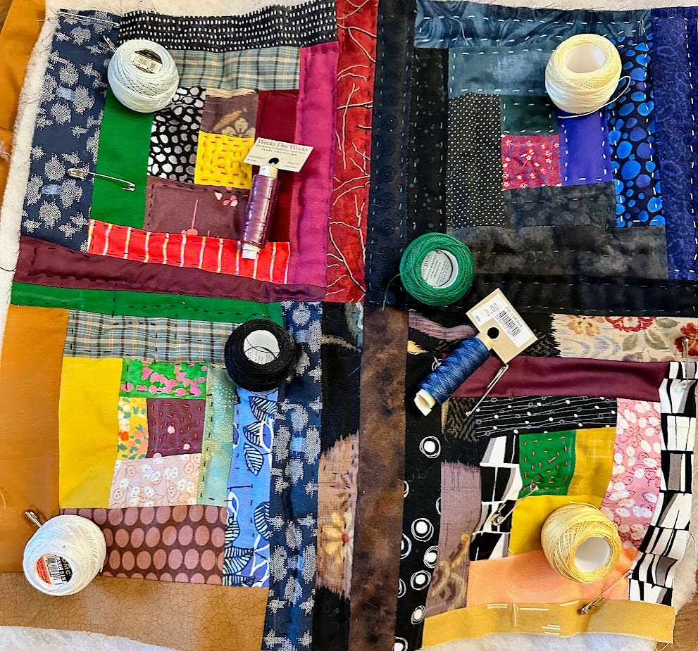 I needed quilting thread and instead of ordering it online I found there is a store nearby that specializes in embroidery supplies, and I was delighted in what I found there: beautiful pearl cotton quilting thread in a wide variety of colors — some hand dyed! And I figured that as long as I used light and dark colors I could move beyond black and white to emphasize the motif. After all the colors change in the quilt by value and chroma , so why can’t the thread change as well?