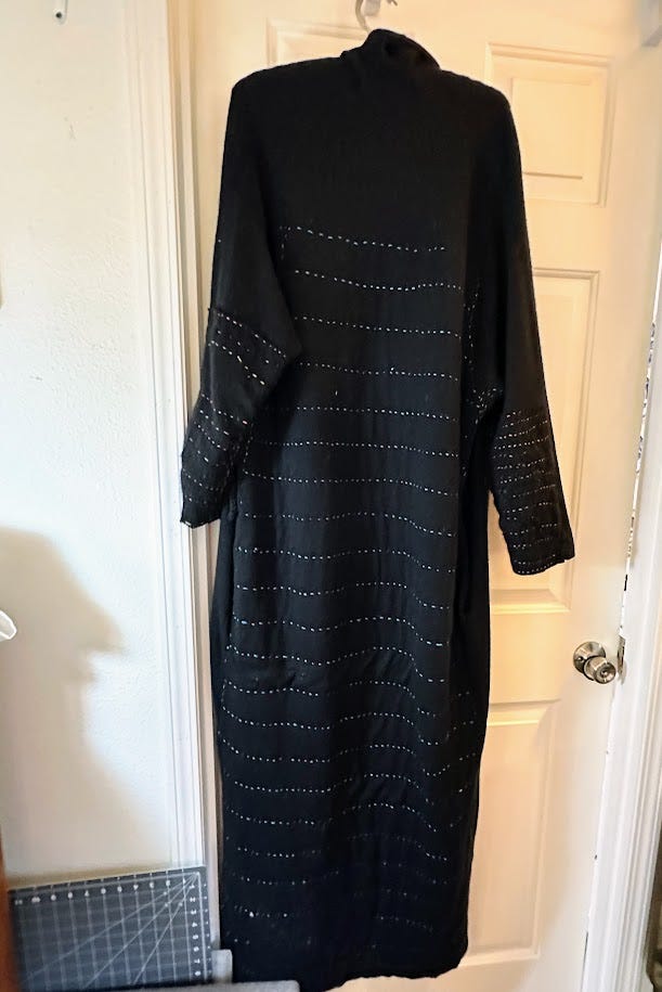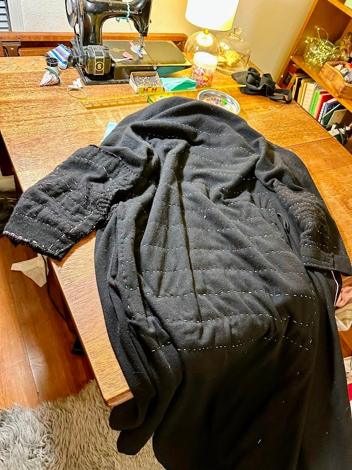 I re-did the sleeves and reinforced the back with fabric cut from thrifted sweaters. I used wool embroidery thread. I will probably keep working on this to make a more interesting pattern with the stitches, but this has added life to a loved but worn-out item - and that is the idea of Sashiko. It’s a work in progress.