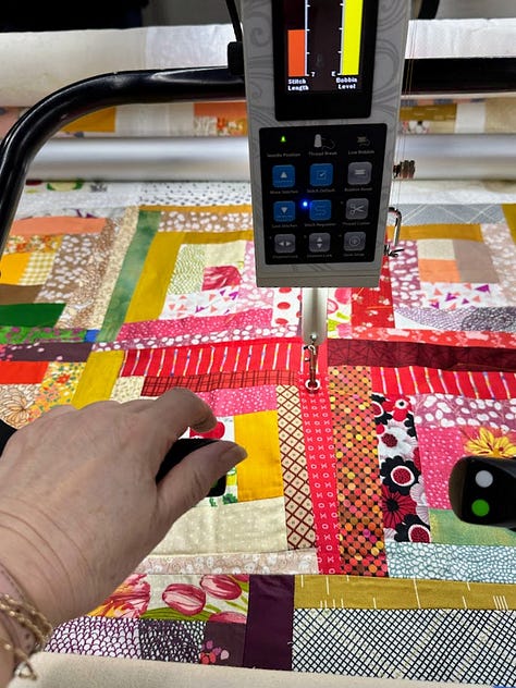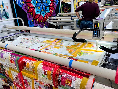 Last Friday, I went to a long arm quilt shop and used the big machine (one pays by the hour, and you get a lot of help) to baste my quilt so I can do the hand quilting. It’s important to get ‘the quilt sandwich’ held together securely so it doesn’t bunch up or get out of place while hand quilting it.