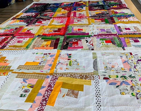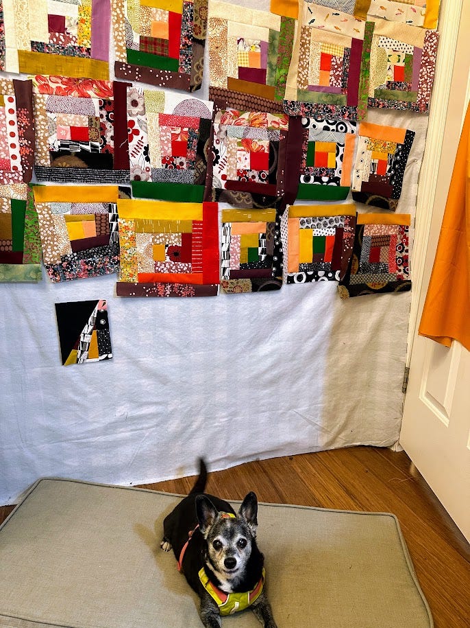 It was a surprisingly emotional experience. A pieced quilt like this holds so much experience, finding the fabrics at thrift shops, shows and fabric stores, cutting and choosing colors, then working with larger pieces. It was also a struggle in many ways since I started it after Dave died and I was grieving. Spike was always beside me. Now he, too, is gone. Yet his love and loyalty are embedded in the many pieces of the log cabin design.